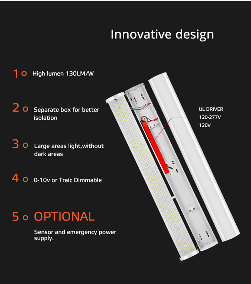 High lumens 130lm/w led batten light,Widely used in garages, warehouses, and other large areas,2ft and 4ft size,20w,32w,40w,48w or Selectable Watts and CCT, CRI 80 or CRI90,High PF,120-277v or 200-240v voltage,optional sensor and Emergency driver.5 years warranty.